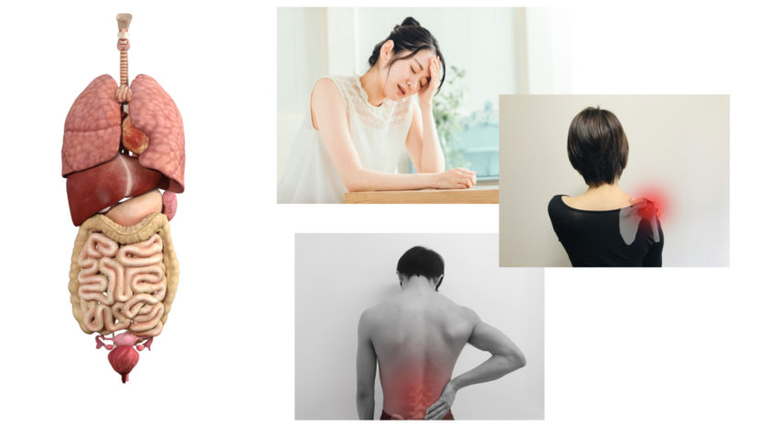 内臓が原因で腰、脚、肩、首、頭などが痛くなる事があります。