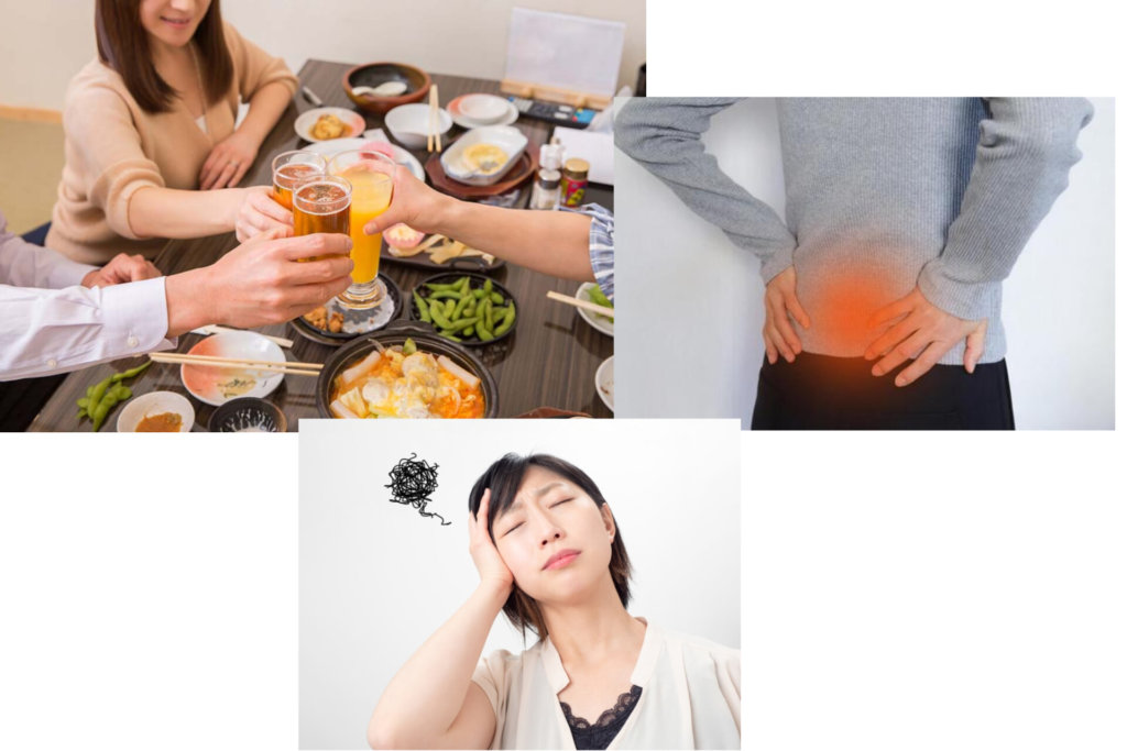 特にありがちなのが、年末年始の食事や飲酒の影響です。