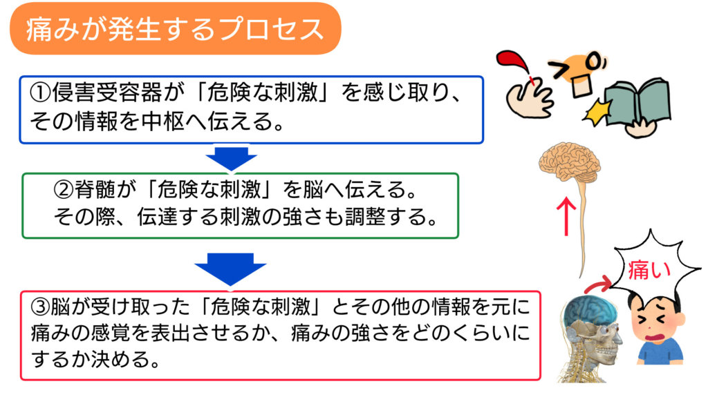 ③脳…危険と思われる刺激を他の環境的情報などと合わせて、痛みの感覚を表出させるか、また、どの程度の痛みを出すか決定する。