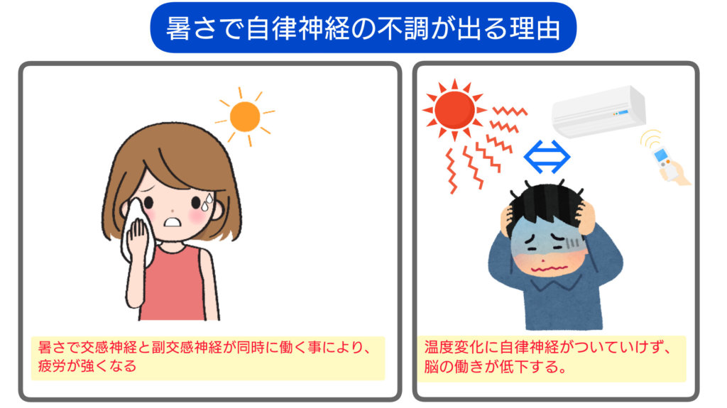 暑さで自律神経の働きが複雑になる上に、室外と室内の温度差に自律神経がついて行けない事が自律神経を大きく乱す原因となっています。