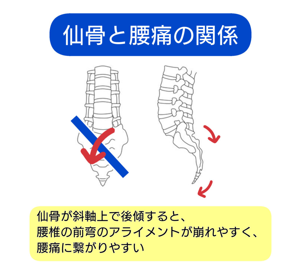 いずれにしても仙骨が後ろに倒れるような状態になると、腰椎の生理的な前弯が保てなくなるため、腰椎周辺の組織に負担がかかり腰痛になりやすくなります。